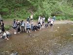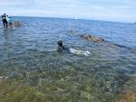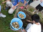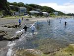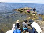 体験学習2日目は快晴ですが風が強めです。早朝からトイレに行ったり、おしゃべりをする声も聞こえましたが、体調を崩す子はいなかったようで優秀です。朝食をモリモリ食べて、水着に着替え海セットを持っていざ海へ。風の影響でカヤック体験はできませんでしたが、その分時間を取っての磯遊びがとても楽しかったようです。「カニ、カニ」「魚獲れたよ」と嬉しそうに見せに来る子がいる一方、「クラゲ怖い」と海に入れない子もいます。それでも時間が経つうちに波打ち際から少し沖に出て波を被って悲鳴を上げたり、なぜか海水浴を楽しむ子も。(浅瀬なのでご安心を)海の楽しさを味わうよい時間でした。