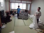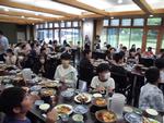 入村式後部屋に入ってベットを決め、シーツを敷いてベットメイクをしますが敷き方が分からない子も多く、一人ずつ「こう、こう」とやって見せます。一通りベットメイクができたらカードゲームで盛り上がったり、狭い部屋でかくれんぼをするメンバーも。そうこうしているうちに食事の時間です。食事係が焼肉サラダセットを手際よく準備してくれます。揃ったところで「いただきます」。おかわりもしておなか一杯になったところで、キャンドルファイヤーの準備です。