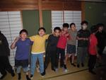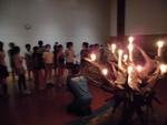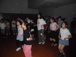 部屋を暗くして火の神と火の子が入場します。学年目標「喜怒哀楽」の火を灯し、キャンドルファイヤーのスタートです。歌、クイズ、ゲーム、ダンスと目いっぱい盛り上がって「楽しいけど、汗かいた!」と言って会場を後にし、お風呂タイムに突入です。水のかけっこなどしつつお風呂でもはしゃぐ子どもたち。朝からこれだけエネルギーを使えばきっと夜はコテンと寝てくれることでしょう。