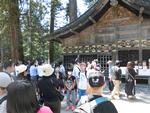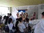 上海から合唱団の子どもたちがやって来ました。5歳から10歳までの子どもたち19名と保護者、日中友好協会、横浜市教育委員会の方もいらっしゃり本校児童と交流しました。最初は白妙囃子のお師匠さんにお願いして鐘と笛、太鼓のリズムでお迎えします。上海の子どもたちは聴き入っていました。音楽室では琴の調べに乗せてお抹茶の体験をします。続いて6年生が入場し歓迎セレモニーです。歓迎挨拶、プレゼント交換、日本の歌(ふるさと)を披露し、合唱団の歌へと続きます。とても上手に、かわいらしく曲を聞かせてくれました。ありがとうございます。最後はみんなで記念撮影「はい チーズ」