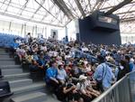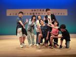 応援に駆け付けた児童と一緒にステージで記念撮影。