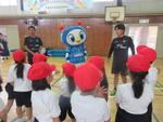 今年も横浜FCのマスコットフリ丸がやって来ました。J1で活躍する横浜のサッカークラブとあって子どもたちは大喜びです。今日は2年生の全クラスがコーチと一緒にサッカー体験をしました。フリ丸やコーチと一緒にたくさん体を動かして最後は記念撮影&ハイタッチでバイバイ!プレゼントもいただき大満足な時間でした。スタッフの皆様、フリ丸ありがとうございました。