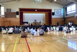 12月24日(火)、体育館にて冬休み前最後の六つリンタイムが行われました。校長先生からは、あいさつ運動にしっかりと取り組んできたことや、お互いに思いやりをもって生活してきたことについてお話がありました。