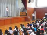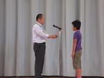 区の水泳大会で良いタイムを出し、市の水泳大会に選ばれた、6年生Kさんが校長先生から表彰されました。