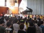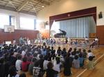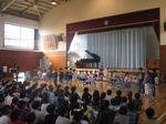 2年生が音楽集会で発表しました。カバサ、マラカス、ギロのかえるの鳴き声から始まった「かえるのがっしょう」の合奏。そして、4か国語でのあいさつを入れた「あなたへのメッセージ」。みんなで楽器の音も声も合わせて発表することができました。