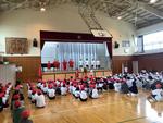 運動会に向けた応援団・マスコットの紹介をする団結式が行われました。団長をはじめとする応援団は声を張り上げ、力のこもった団員紹介をしました。