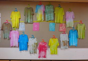個別支援学級の児童が、3色の染料を自分で組み合わせたり、輪ゴムで一部を縛って模様を作ったりしながら、自分色のTシャツを作成しました。
