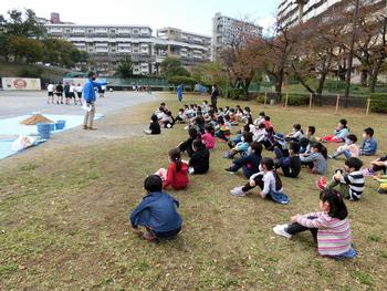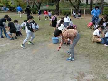 1年生が校庭の芝生の種まきを行いました。