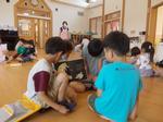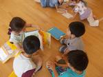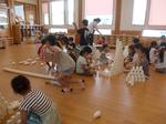 今回はクラスごとに西柴保育園に出かけました。可愛い園児さんが出迎えてくれる中、すみれ組さんとの交流です。練習した絵本や紙しばいの読み聞かせ、塗り絵、折り紙、ドミノ、紙コップタワーを一緒に楽しみました。