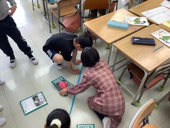2年生は算数で「長いものの長さ」の学習を行いました。リボンの長さがどのぐらいなのかグループで考え、1mの長さについて体験しながら理解しました。