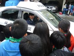 交通安全の話では、大型車が左折する時に生じる「内輪差」を初めて知りました。警察官の仕事内容を聞いたり、装備品を見たりしました。また、パトカーや白バイなどの警察車両を見せてもらいました。実際に乗ることもでき、少しドキドキでした。