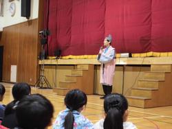 先日、劇団め組の方々を招き、体育館で芸術鑑賞会を行いました。4年生は5、6年生と一緒に芥川龍之介作「杜子春」の演劇を鑑賞をしました。