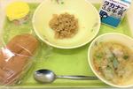 ロールパン、牛乳、ツナペースト、肉団子とはくさいのスープ、ラフランスゼリー