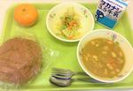 はいがパン、牛乳、カレービーンズシチュー、野菜ソテー、みかん