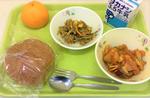 はいがパン、牛乳、チリあまさつまいもチリ・コン・カン、ごぼうソテー、ぽんかん