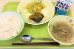 麦ごはん、牛乳、さばの甘酢あんかけ、ゆで野菜、茎わかめスープ
