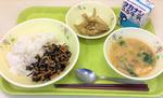 麦ごはん、牛乳、ひじきごはんの具、魚のから揚げ、呉汁