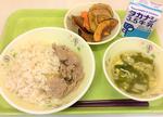 麦ごはん、牛乳、いわしのかば焼き、ごまじょうゆあえ、沢煮椀
