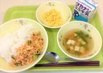 ごはん、牛乳、菜の花ごはんの具(さけそぼろ・卵そぼろ)、すまし汁