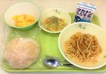 ソフトフランスパン、牛乳、スパゲティミートソース、キャベツとじゃこの炒め煮、ミックスフルーツ