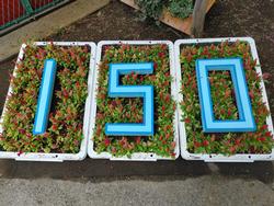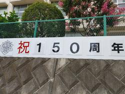 150周年に向けて、正門に看板と花を用意しました。花壇の花は、技術員さんと栽培委員会の子どもたちが季節に合わせ、変えていく予定です。