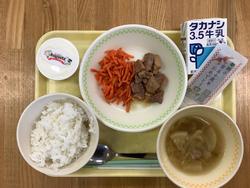 横浜のブランド「はまポークの甘辛煮」や地域の阿部さんの畑でとれた大根と人参を使って「大根のぽかぽか汁」と「にんじんのおかか和え」がでました。 のりは、給食委員会さんが全校から募集した特別パッケージに包まれています!!そして、デザートには相澤良牧場のアイスクリーム。