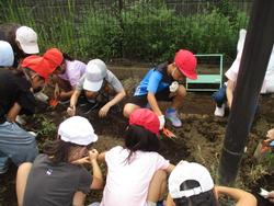 学校の畑を耕す2年生。まちの先生2名もやり方を教えながら、お手伝いしてくださいました。子どもたちに、「何を植えるの?」と質問すると、「ないしょ!!」という返答。一体何が始まるのでしょうか??