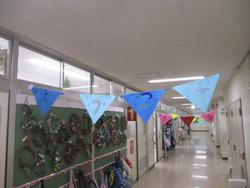 廊下が商店街?運動会??のようになっています。1年生の廊下が華やかになっています。何が始まるのでしょうか??