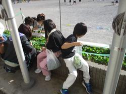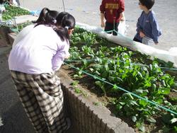2年生が、野菜の収穫を行っていました。小松菜は大きくておいしい野菜になるように、間引きをしていました。取った葉も持ち帰って食べたようです。エコですね!!