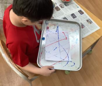 23時間目、図工で絵の具を使い、筆を使わないで、いろいろ工夫して、いろいろな塗り方をしました。🎨