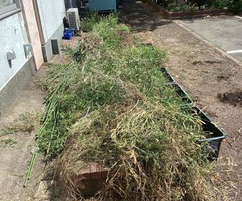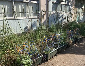 夏の間、トマト、キュウリ、ナス、カボチャ等、昇降口前の植えた畑の草を抜きました。