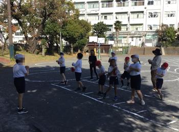 準備体操の後、低学年は、くねくね鬼ごっこ、しっぽとり、缶ポックリ、忍者ごっこをしました。高学年は、ハードルをしました。