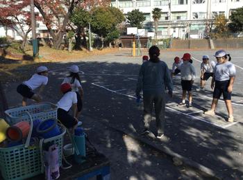 準備体操の後、低学年は、大縄、短縄、しっぽとり、缶ポックリをしました。高学年は、タグラグビーをしました。