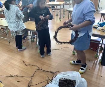 5時間目、芋掘りをしたサツマイモのツルを使って、クリスマスリース作りの準備をしました。