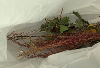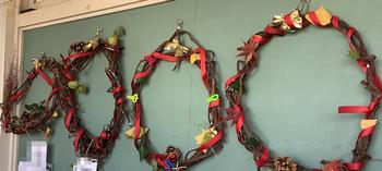 サツマイモのツルに、自然のもの(松ぼっくり、ヒイラギの葉っぱ、風船かづら、どんぐり、イチョウやクヌギの葉っぱ等)校庭にある植物を巻き付け、木工用のボンドで付けて飾り付けをしました。