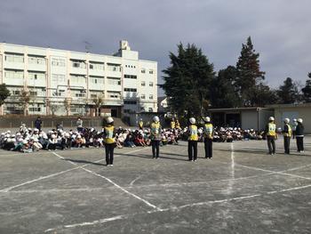 訓練の放送が流れたら、校庭の児童は校庭の真ん中に避難して、また教室にいる児童は机の下に避難して、ヘルメットをかぶり、『おかしも』の約束を守り、素早く列に整列して、校庭に避難しました。