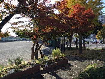 山田小学校の南門の側にある紅葉の葉っぱが赤く染まってきました。