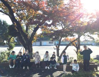 朝運動の後、みんなで秋の紅葉の前で、写真を撮りました。📸