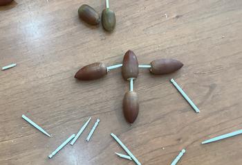 どんぐりに穴を開けたり、竹串や爪楊枝を通したり、ボンドでとめたりして、完成させました。