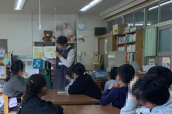 まず、学校司書の先生から、『10ぴきのかえるの家 』という本を読んでいただきました。