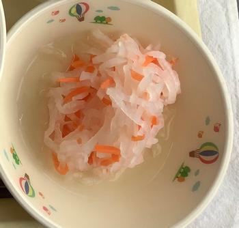 今日は、お正月のおめでたい料理として紅白の「なます」と「白玉ぞうに」が出ました。