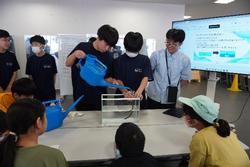 参加した小学生は、ストローをティッシュペーパーでこすって帯電させ、静電気の力でアルミ箔を動かしたり、蛇口から流れ出る水の流れを曲げたりする実験を行い、サイエンス委員から、静電気の起こるしくみについての説明を聞きました。
