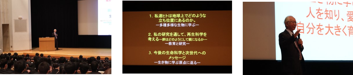最後に、質疑応答の時間も設けてくださり、高校1年次生からさまざまな質問が寄せられました。浅島先生は全ての質問に丁寧にお答えくださり、命に真摯に向き合っていらっしゃる姿勢を示してくださいました。1学期の放課後に「浅島サロン」を開催し1年次16期の生徒全員と対面する機会を設けてくださった浅島先生に、生徒たちは1年間の成長ぶりをお見せできたかもしれません。