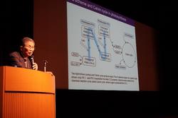 最後に、「なぜ私たちは研究を続けていくのか」という問いを生徒たちに投げかけられました。資源やエネルギーの乏しい日本だからこそ、科学技術立国を目指していくことの重要性を説かれ、研究の成果が人類の繁栄に寄与できることをお話しいただきました。ご講演後は、生徒たちからの多岐にわたるたくさんの質問に丁寧に答えていただきました。入学したばかりの生徒たちにとって、藤嶋先生ご自身の経験を通して研究のすばらしさを伺う機会となりました。