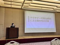 高校生による発表としては珍しい口頭発表に挑戦し、「ケラチナーゼ産生細菌による髪の毛の分解」という題目で研究成果を発表しました。本研究は、髪の毛がケラチンというタンパク質から構成され、炭素や窒素を豊富に含むことから、肥料としての活用の可能性に着目したものです。一方で、ケラチンはジスルフィド結合を多く含むため分解されにくいという課題があります。そこで本研究では、前処理によって細菌の働きを促進し、髪の毛の分解を効率化できるかを検証しました。
