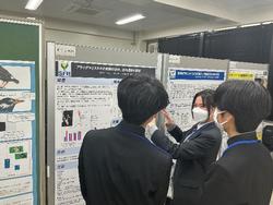 午後はポスターセッションを通して活発な情報交換の場となりました。上家さんは「サカサクラゲの「青い棒」は何のためにあるのか?」、河北さんは「アライグマとタヌキの前腕の回外、回内運動の評価」、そして斉藤さんは、「雑食動物における食性傾向と咀嚼筋発達度の関係」というテーマで発表を行いました。初めは緊張していましたが、時間内に回数を重ねることで自信をもって発表することができました。他校の高校生や大学生、大学院生や教員の方に本校の研究活動に興味を持っていただき、多方面からアドバイスを受けたことで今後の研究活動を続けていくための有益な時間となりました。