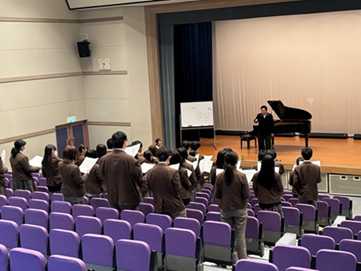 音楽コース2年生を対象に、洗足学園音楽大学の篠原先生の出張授業が実施されました。音楽の成り立ちから現在のミュージカルに至るまで幅広くご講義いただき、最後には先生が作曲されたミュージカル楽曲を全員で「歌って踊る」体験をさせていただきました。ミュージカルという新鮮な音楽ジャンルに触れ、楽しく充実した時間を過ごすことができました。