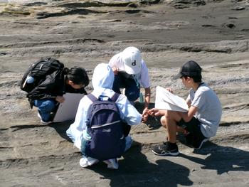 班のリーダーの生徒たちは、事前に現地で横浜国立大学教育学部の河潟俊吾先生からレクチャーを受けて準備を行い、当日は各リーダーが班の生徒たちに地層の成り立ちや変化等を詳しく説明しました。