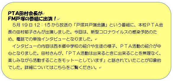 本校PTA活動 エフエム戸塚で紹介予定!!エフエム戸塚の番組に本校PTA活動の様子が紹介されることになりました!! 日時は、5月19日(火)12:15からで、5~7分程度です。 内容は、西本郷中学校の紹介とPTA活動の紹介などのようですが、どのように紹介されるか楽しみです。 ぜひ、お時間がありましたら、聴いてみてください。