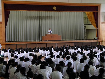 今日は1学期の終業式です。終業式に先立って、陸上部、バドミントン、エレクトーンの表彰が行われました。校長先生から、ここまでの振り返りについてのお話をいただきました。また、生徒指導部より夏休みの生活についての注意がありました。